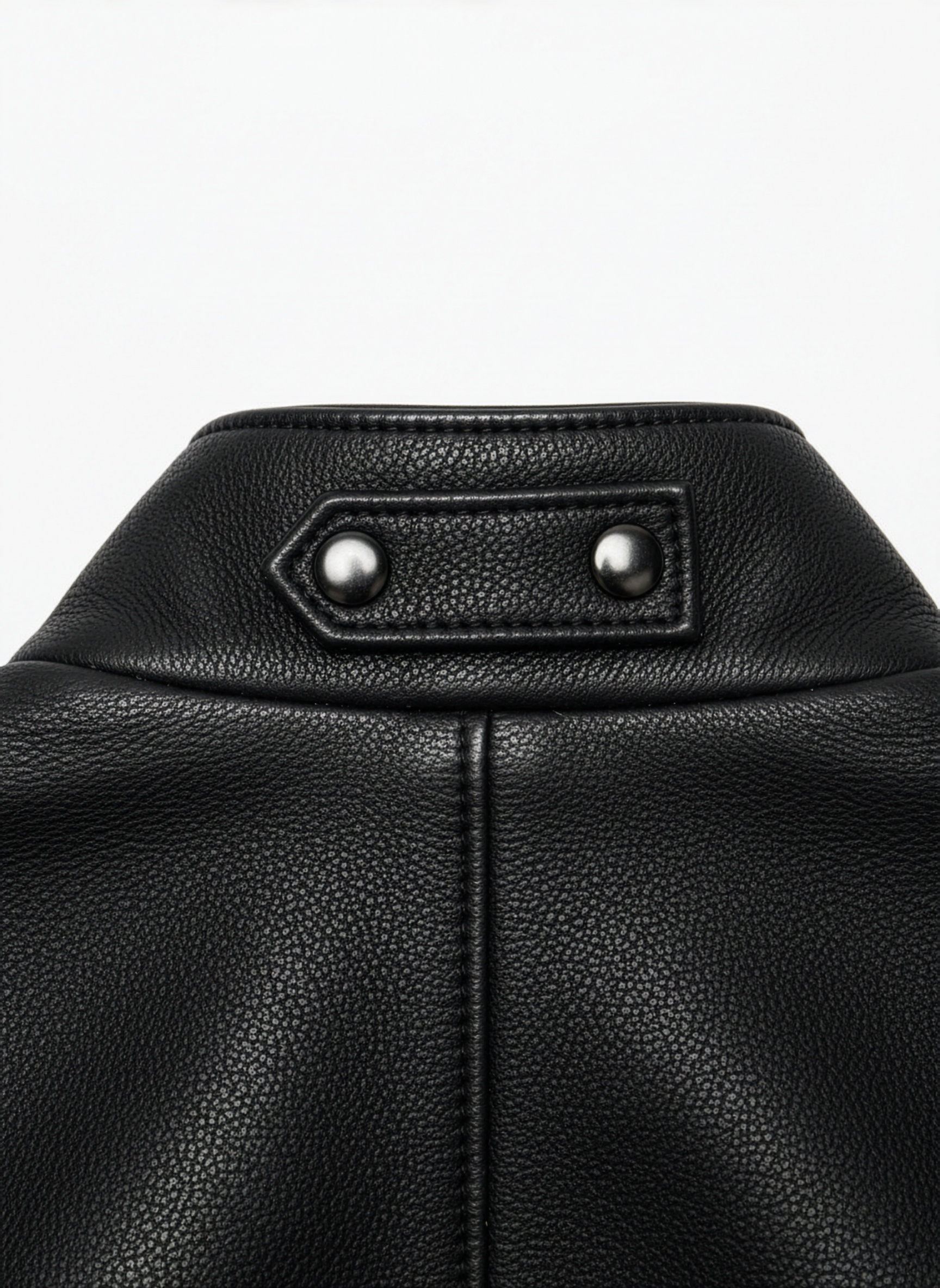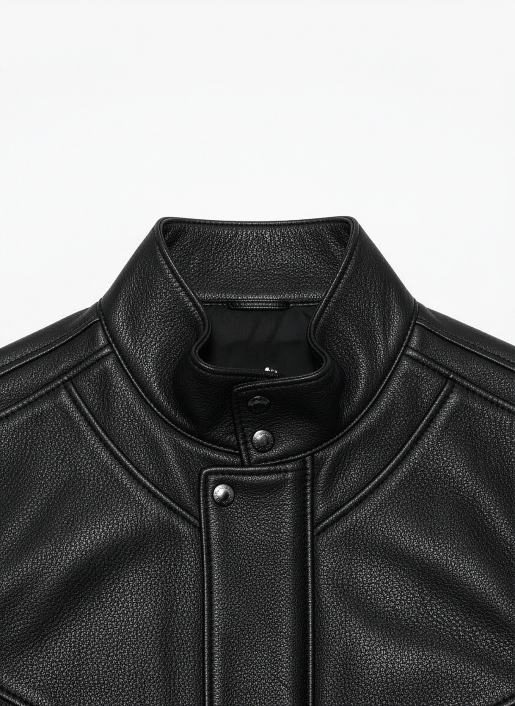 Made from micro-pebble microfiber vegan leather, this jacket pairs a structured moto silhouette with soft, lightweight wear. Contoured paneling, satin lining, rib-knit cuffs, and brushed metal hardware complete a clean, durable, modern finish.