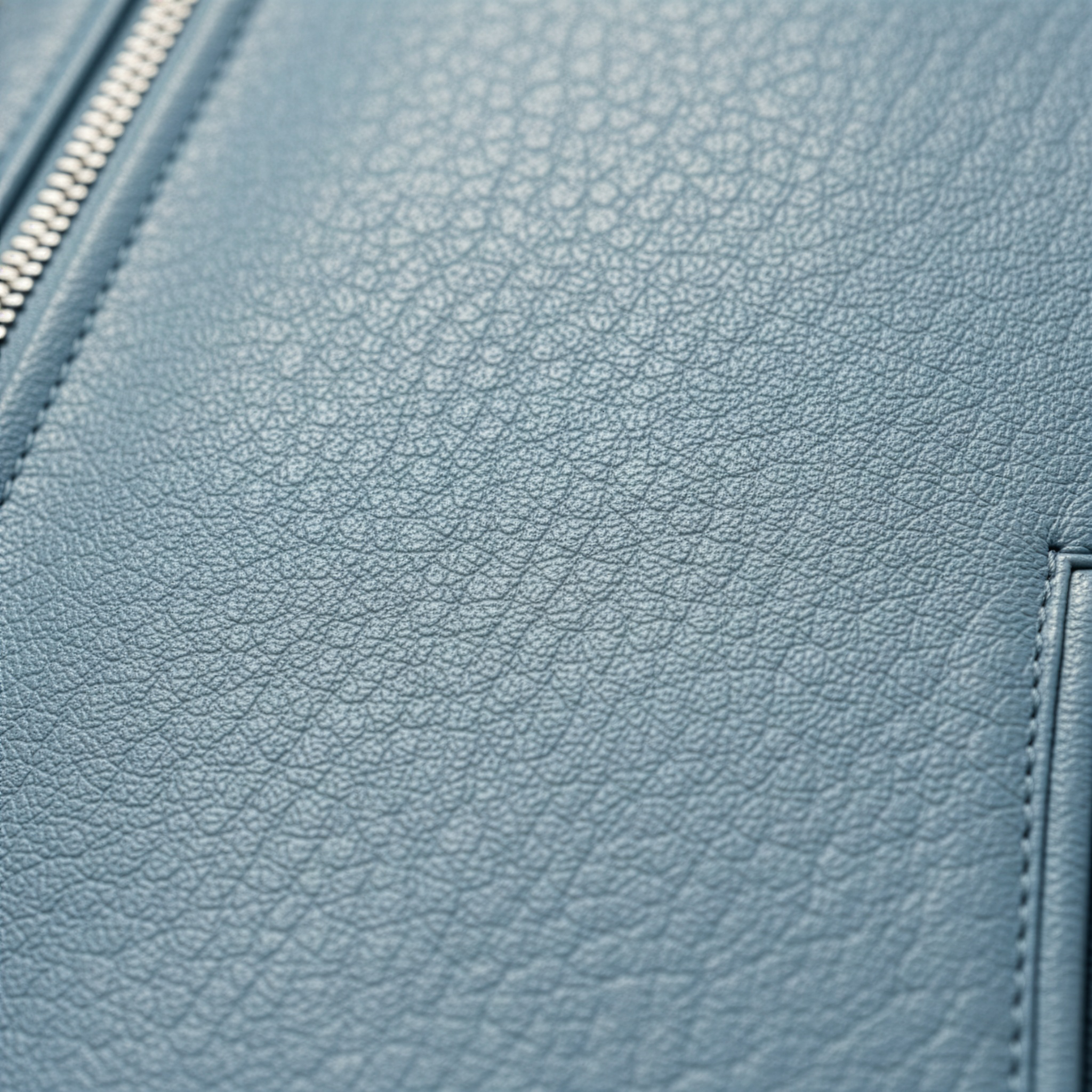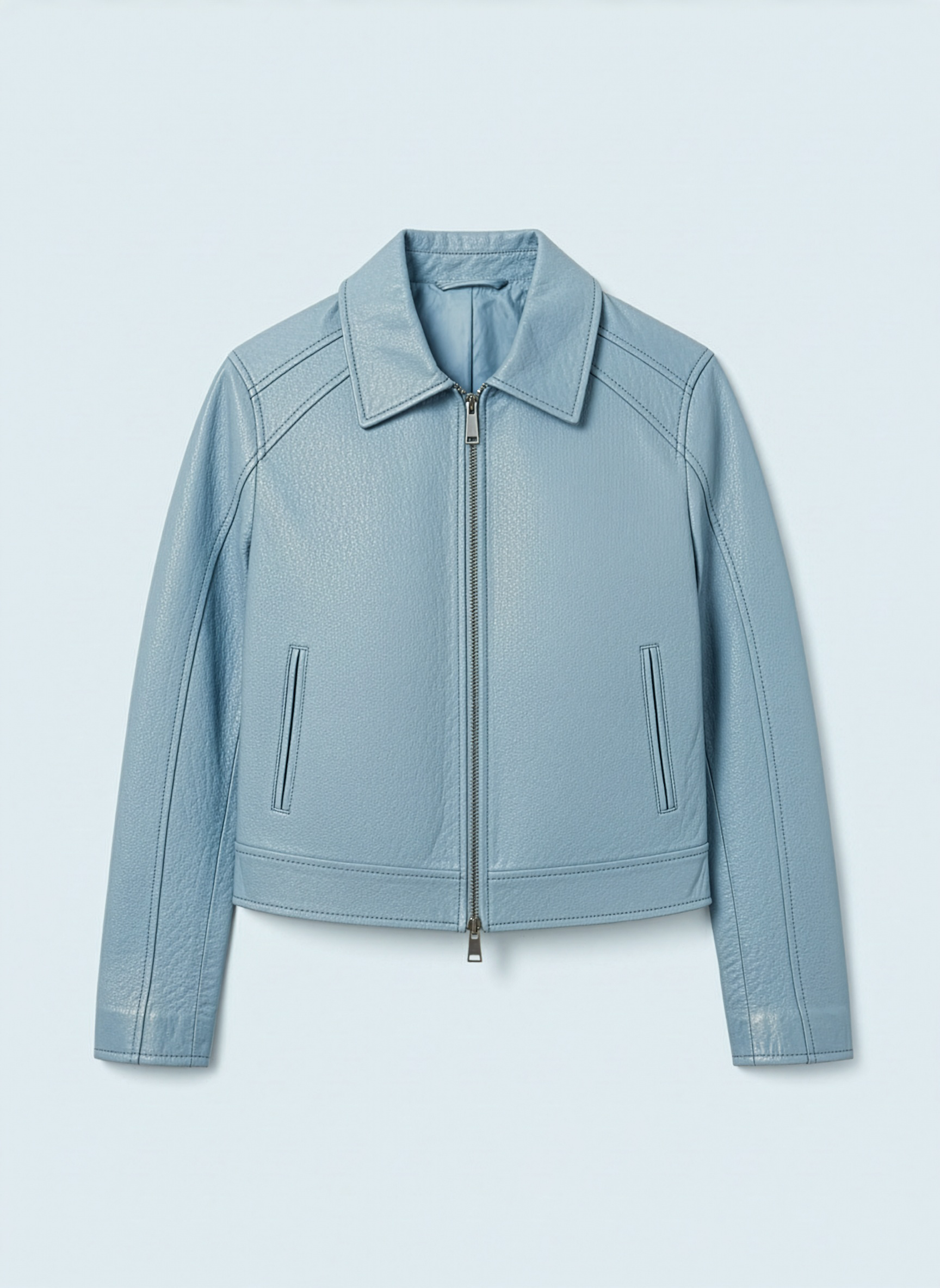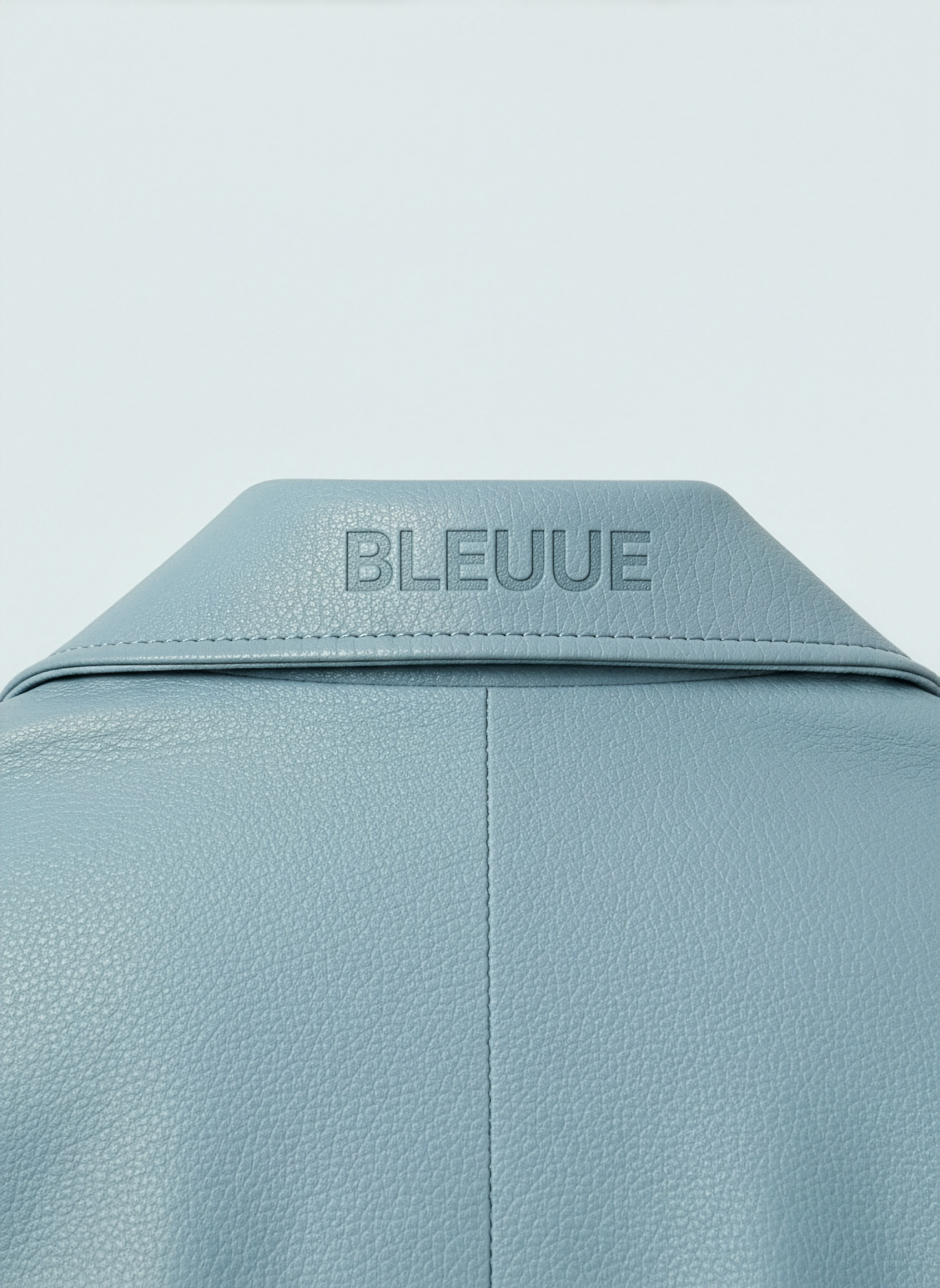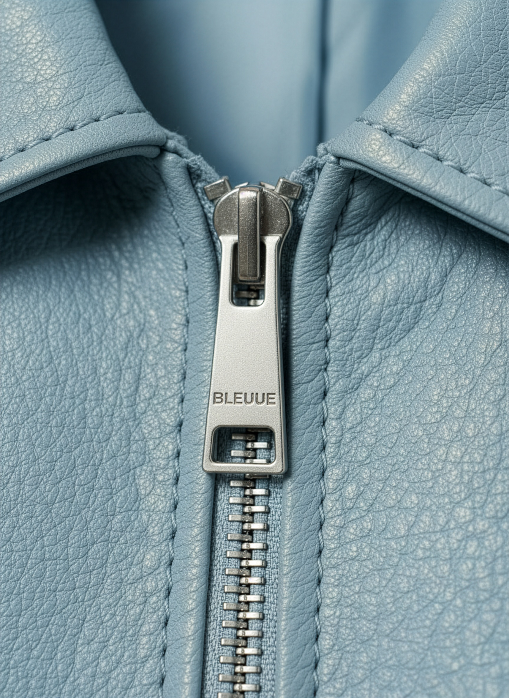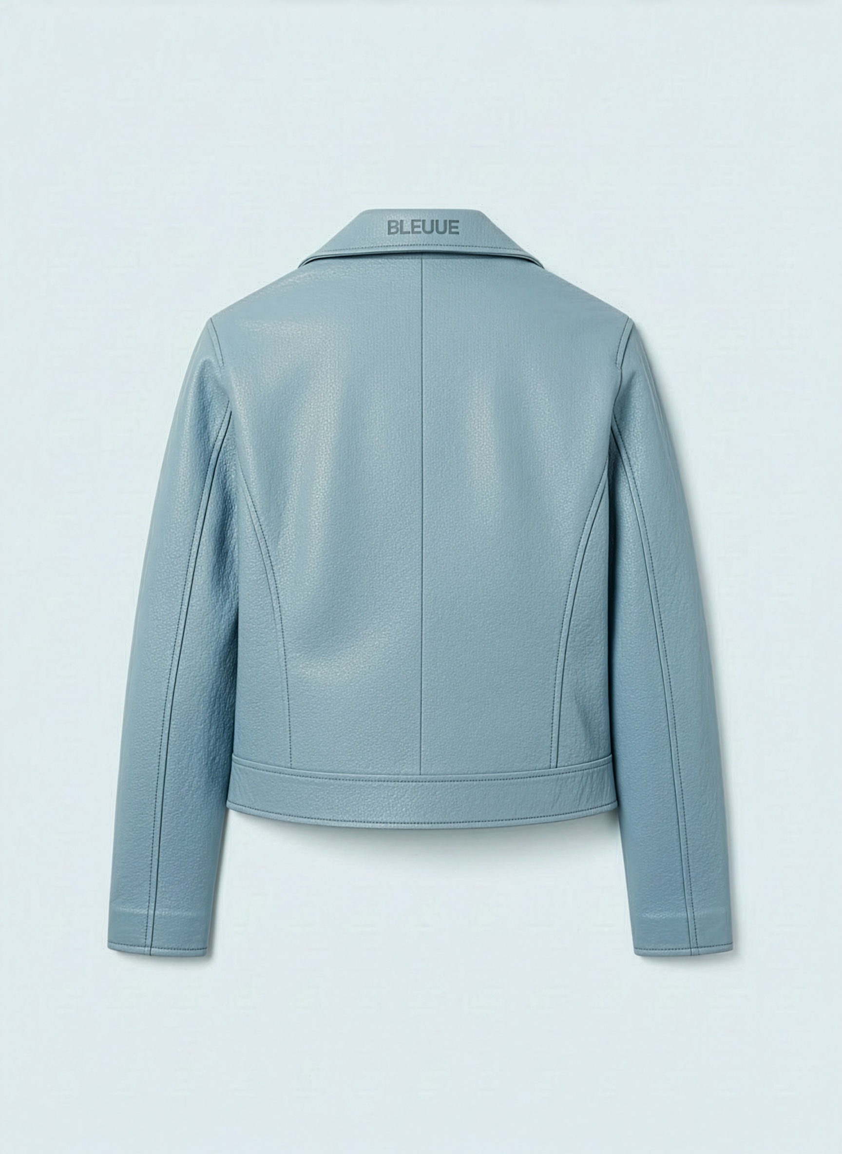 Cut from pebbled microfiber vegan leather, it features a cropped silhouette with paneled shoulders, welt side pockets, and a polished metal front zipper. The collar is finished with a subtle debossed BLEUUE logo, with clean edge-stitching throughout and a smooth satin lining for lightweight comfort.