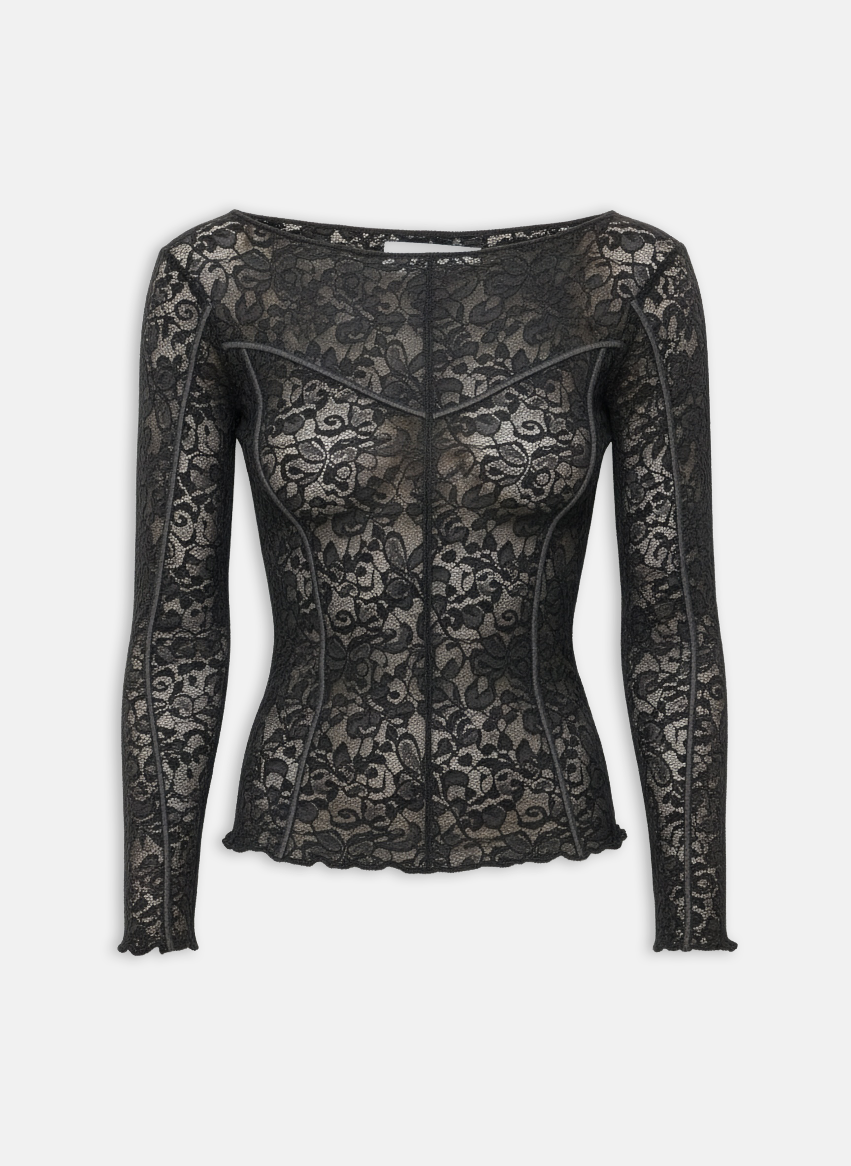 Constructed from lightweight stretch lace with a sheer finish and soft structural seams that contour the body, anchored by a continuous center seam running the full length of the garment as a signature BLEUUE motif. The long-sleeve silhouette is cut close with subtle shaping through the waist and chest, finished with raw-edge hems for fluid movement