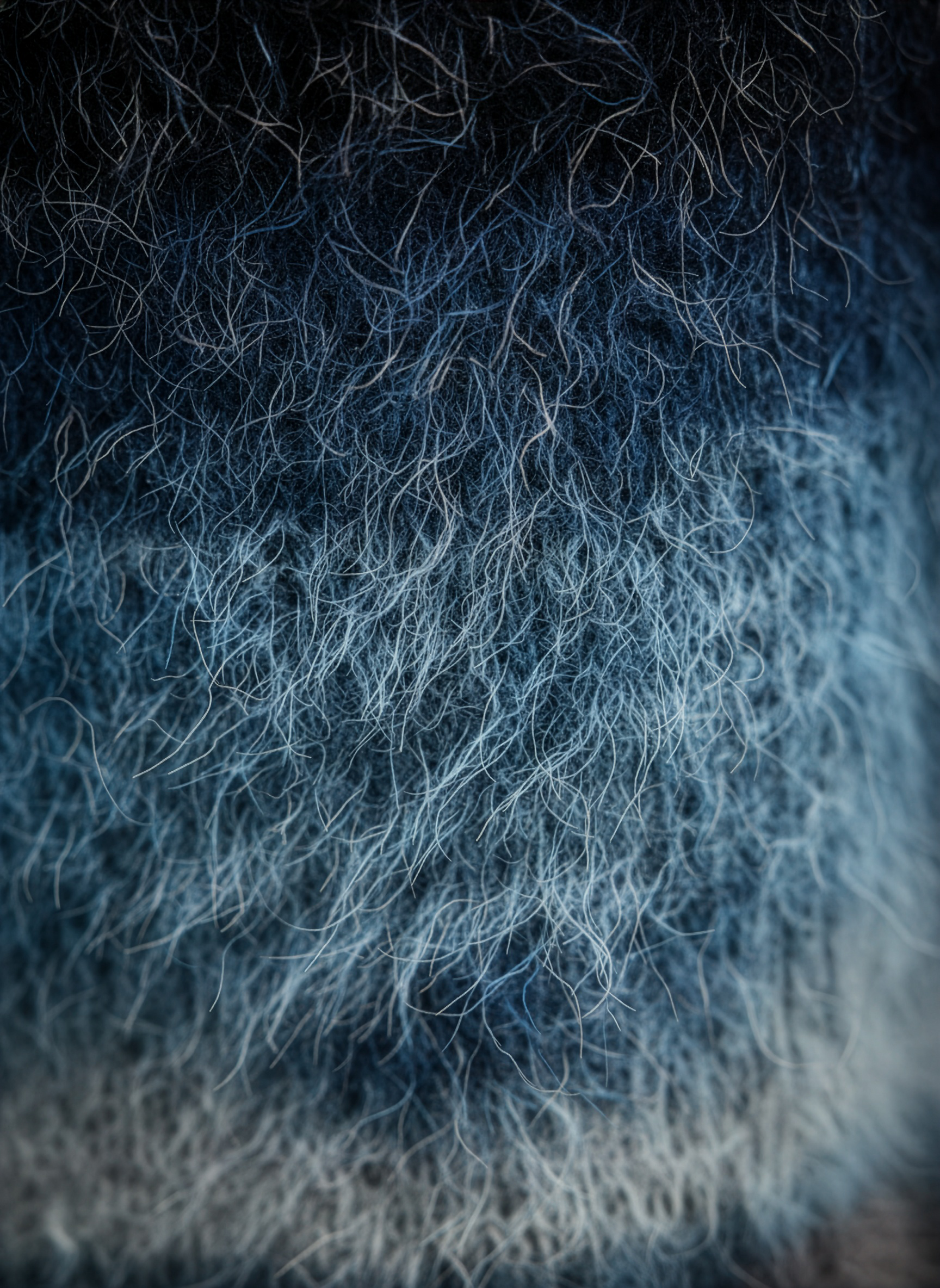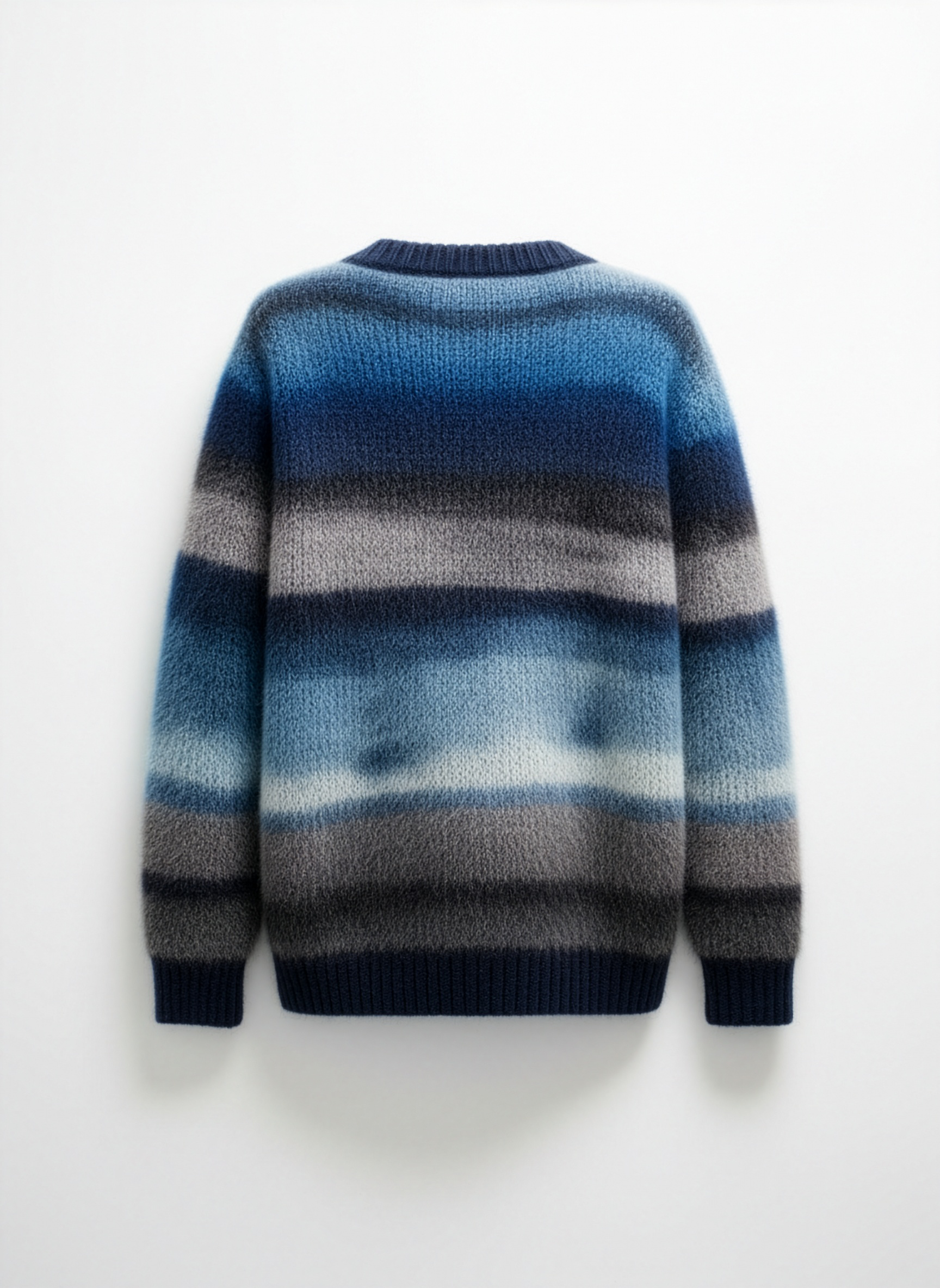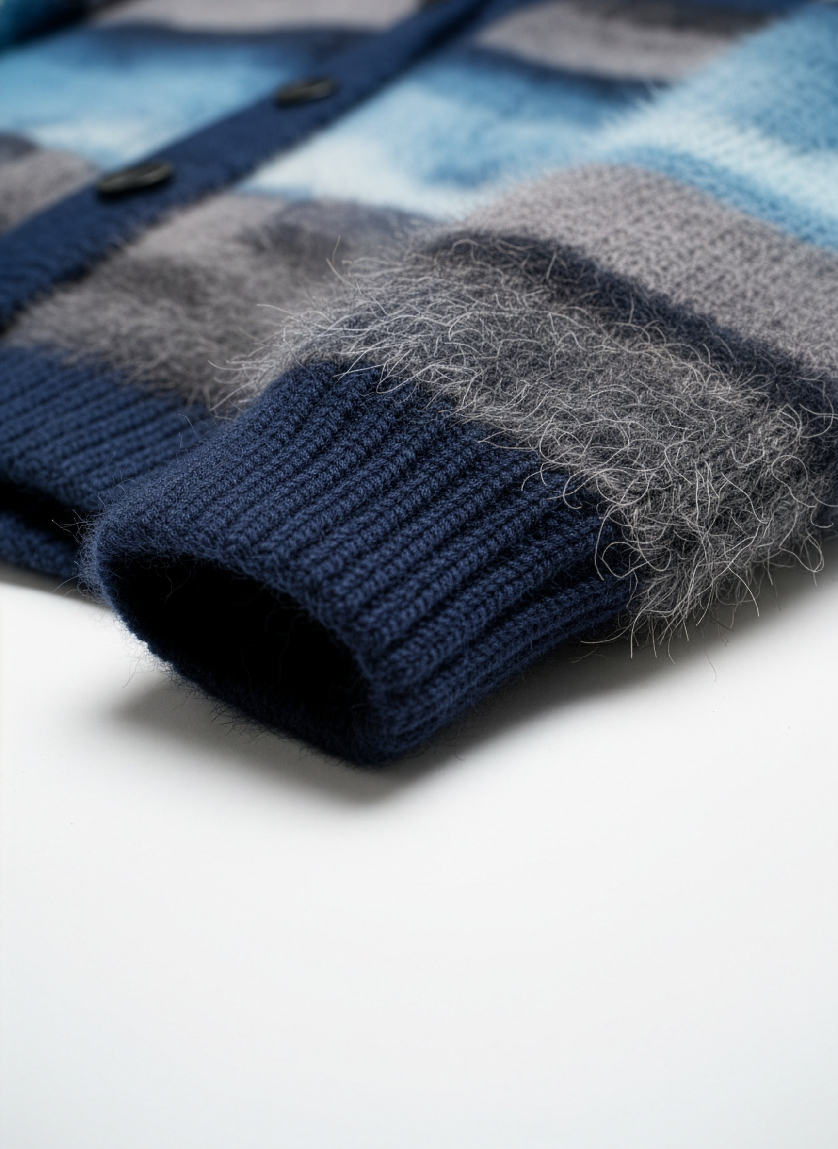 A brushed mohair-blend cardigan engineered with a soft, atmospheric gradient in deep navy, ash grey, and ice-blue tones. Knit in a plush long-hair yarn with ribbed trims and a clean buttoned placket, the piece carries a warm, weightless texture and an easy, relaxed drape. Designed for everyday comfort with a quietly elevated finish.