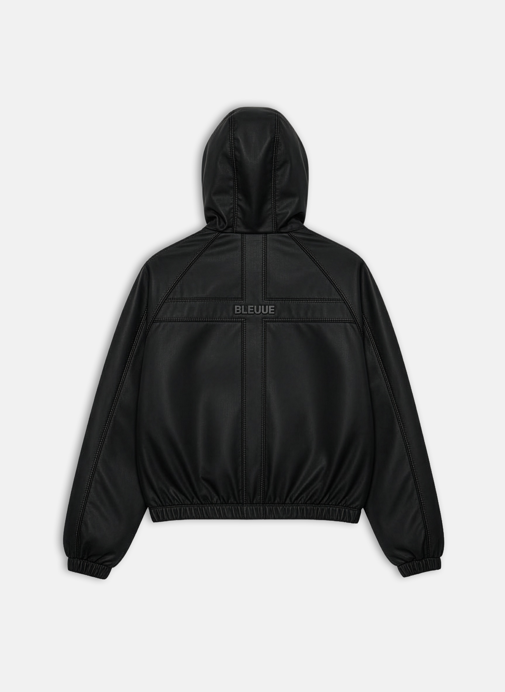 Cut from a proprietary high-density coated nylon with a matte technical finish, it is shaped through a grid of architectural panel lines that structure the silhouette without adding weight. The half-zip opening, sculpted hood, and elasticated hem refine the fit, while a front utility pocket anchors the design. Finished with reinforced top-stitching and clean internal construction.